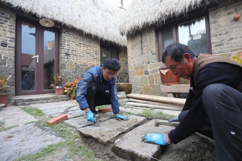 于海洋(左)正在装修民宿。本报记者 王彦博 摄